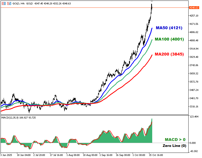 📌 จากภาพราย 4 ชม. จะเห็นได้ว่าราคาทองคำยังมีการ Break High ขึ้นไปทำ High ใหม่อย่างต่อเนื่อง โดยเมื่อช่วงเช้าที่ผ่านมาสามารถทะลุ High เดิม 4330 ขึ้นไปทำ All-Time high ครั้งใหม่ที่ 4380 แล้วย่อตัวลงมาที่ 4279 ก่อนเด้งกลับขึ้นไปทดสอบแนวต้าน 4380 อีกครั้ง แต่ยังไม่ผ่าน โดยให้ระมัดระวังการไล่ซื้อ เนื่องจากราคาเข้าสู่ภาวะซื้อมากเกินไป (Overbought) ซึ่งอาจเกิดการพักตัวในระยะสั้น แนะนำหาจังหวะขายหากราคาดีดตัวขึ้นไม่ผ่านแนวต้าน 4380/4418 และเข้าซื้อเมื่อราคาย่อตัวไม่หลุดแนวรับ 4321/4299 เพื่อเก็งกำไรระยะสั้น >>>
