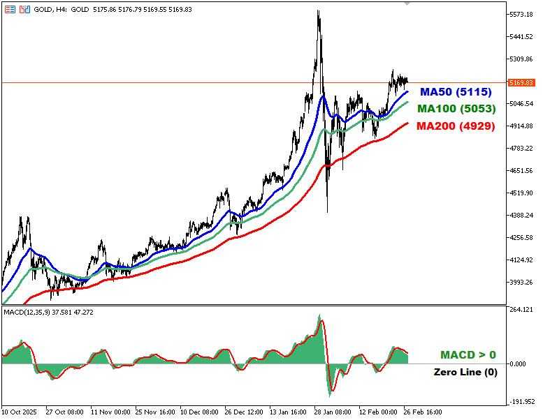 🚩 เมื่อวานราคาทองคำเปิดตลาดที่ 5,143 ช่วงแรกย่อตัวลงทำ Low 5,155 ก่อนมีแรงซื้อดีดกลับขึ้นไปทำ High 5,217 แล้วปิดตลาดที่ 5,164 (+21 USD) เนื่องจากนักลงทุนเข้าซื้อสินทรัพย์ปลอดภัย ท่ามกลางสถานการณ์ตึงเครียดระหว่างอิหร่านกับสหรัฐฯ โดยนักลงทุนจับตาการเจรจานิวเคลียร์รอบที่ 3 ระหว่างคณะผู้แทนของอิหร่านและสหรัฐฯ ที่นครเจนีวา ประเทศสวิตเซอร์แลนด์ ในวันนี้ (26 ก.พ.) รวมทั้งความกังวลว่ามาตรการภาษีศุลกากรจะทำให้เงินเฟ้อปรับตัวสูงขึ้น กราฟรายวัน (Daily) ปิดเป็นสัญญาณ Bullish แท่งสีเขียวมีไส้เทียนด้านบน เปิดตลาดวันนี้ราคาทรงตัวเหนือระดับ 5,150 ล่าสุดยืนอยู่ที่ 5,181 >>>
