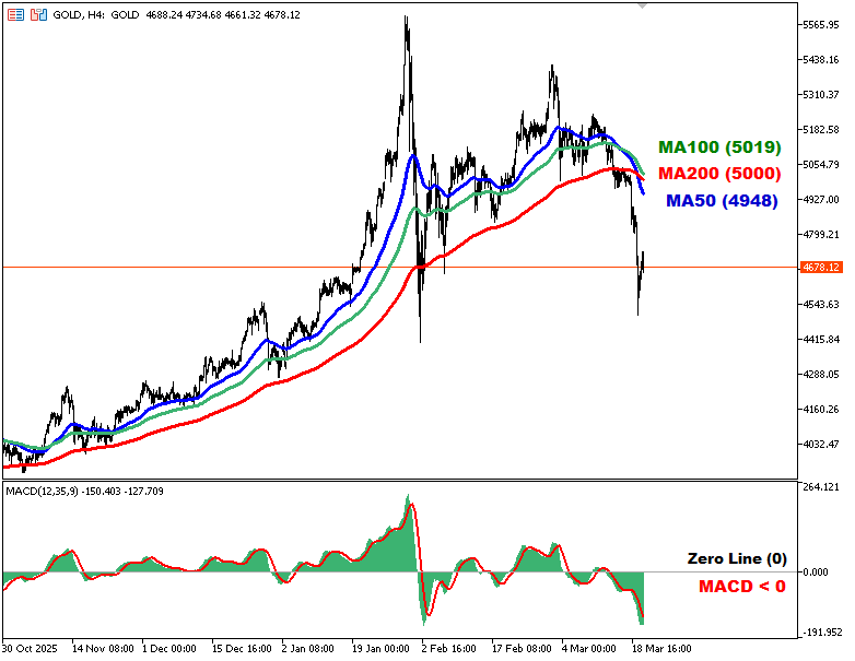 🚩 เมื่อวานราคาทองคำเปิดตลาดที่ 4,818 ช่วงแรกดีดขึ้นไปทำ High 4,866 ก่อนมีแรงขายหลุดระดับ 4,600 ลงมาทำ Low 4,502 แล้วปิดตลาดที่ 4,650 (-168 USD) เนื่องจากนักลงทุนกังวลว่าสถานการณ์ตึงเครียดในตะวันออกกลางที่ผลักดันราคาพลังงานพุ่งขึ้นและเสี่ยงที่จะทำให้เงินเฟ้อสูงขึ้นด้วยนั้น อาจทำให้ธนาคารกลางต่าง ๆ ทั่วโลกพากันตรึงอัตราดอกเบี้ยไว้ที่ระดับสูงเพื่อควบคุมเงินเฟ้อ ทั้งนี้ เครื่องมือ FedWatch Tool ของ CME Group บ่งชี้ว่า นักลงทุนมองเห็นโอกาสเพียงเล็กน้อยที่เฟดจะปรับลดอัตราดอกเบี้ยก่อนช่วงกลางปี 2570 กราฟรายวัน (Daily) ปิดเป็นสัญญาณ Bearish แท่งสีแดงมีไส้เทียนด้านล่าง เปิดตลาดวันนี้ราคาฟื้นตัวกลับขึ้นไป ล่าสุดยืนอยู่ที่ 4,678 >>>